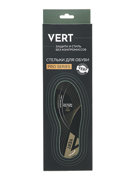 Вкладные стельки VERT изготовлены из трех современных материалов, обладают эффектом памяти и амортизирующими свойствами. Они гигиеничные, антибактериальные и не теряют своих свойств при длительной носке.