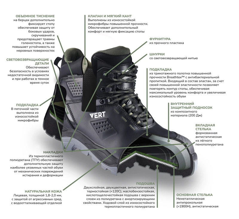 Обувь серии VERT 3000 - безупречное сочетание стиля, комфорта и передовых технологий! Надежная защита от агрессивных сред, механических воздействий в любое время года позволяет обеспечить безопасность сотрудникам самых различных отраслях промышленности.