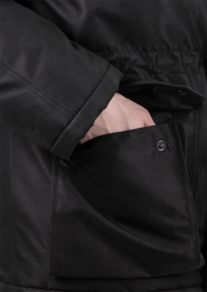 • капюшон с регулировкой объёма и съёмной меховой опушкой