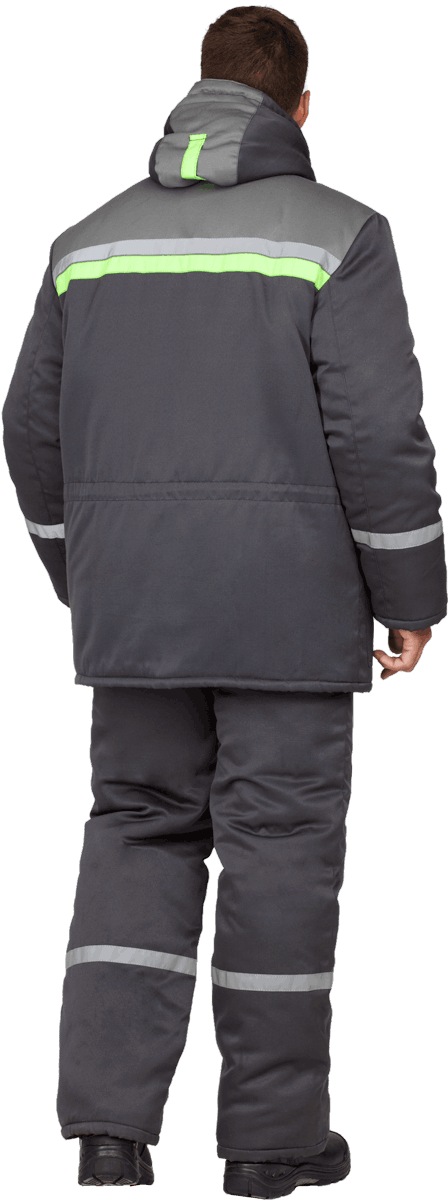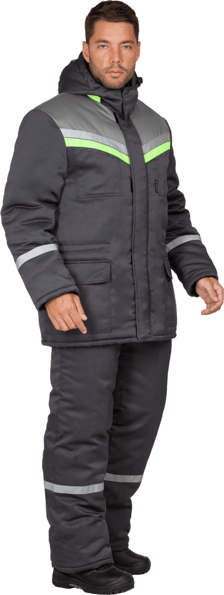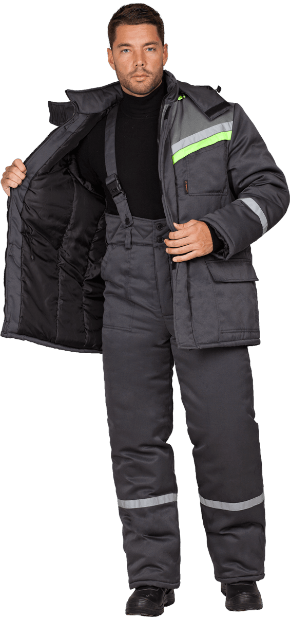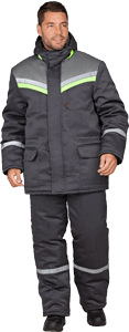 Костюм состоит из куртки и брюк. В костюме используется световозвращающая полоса