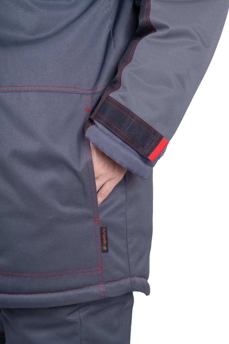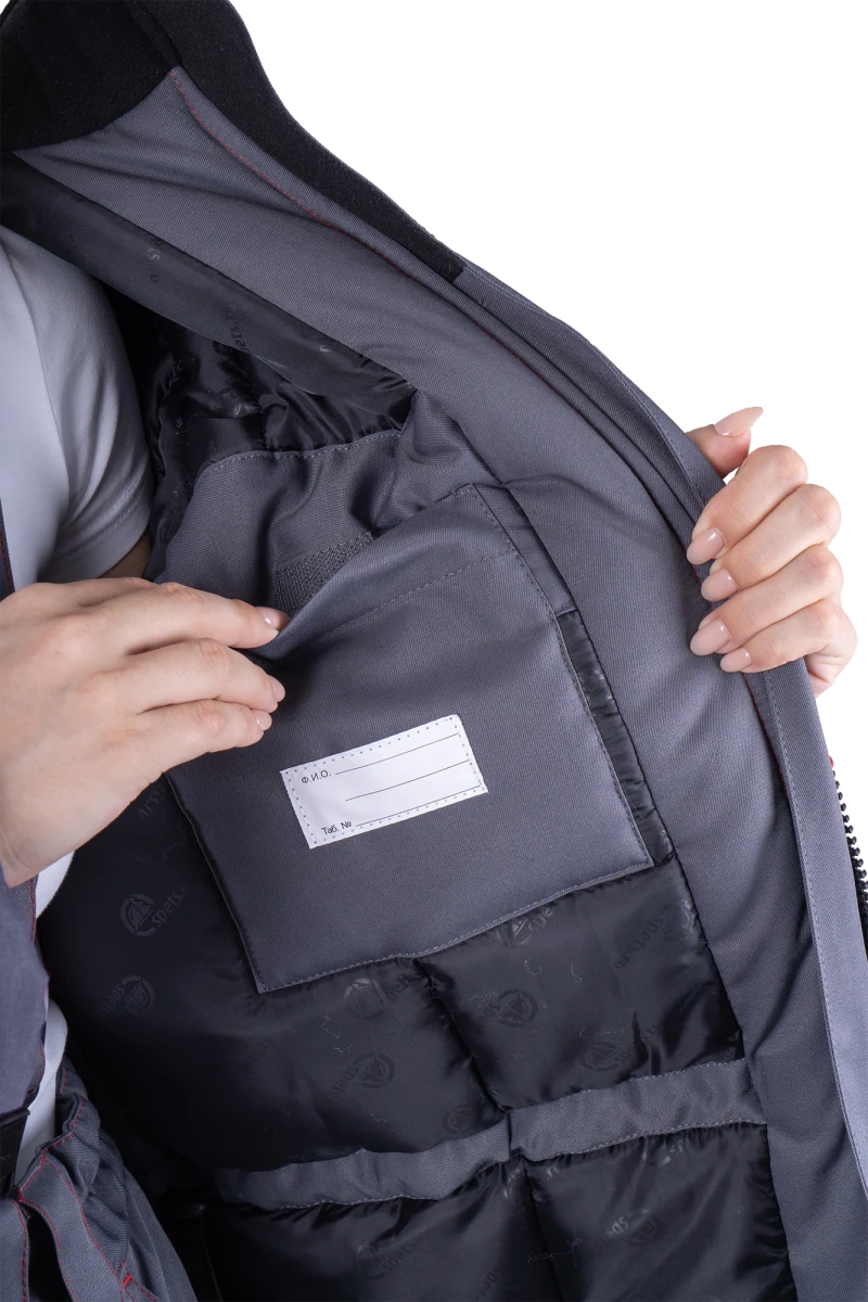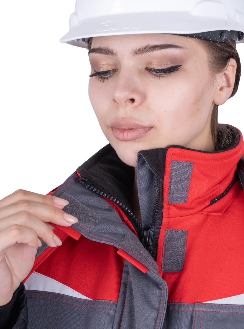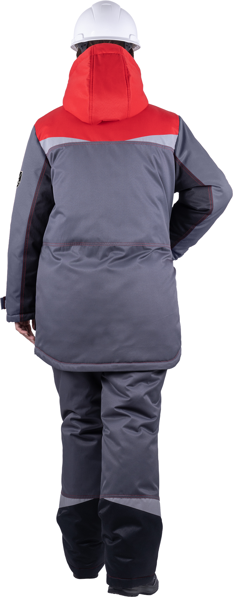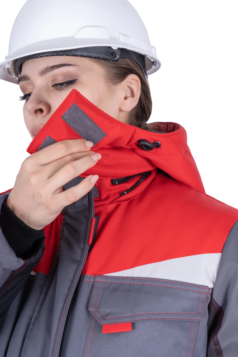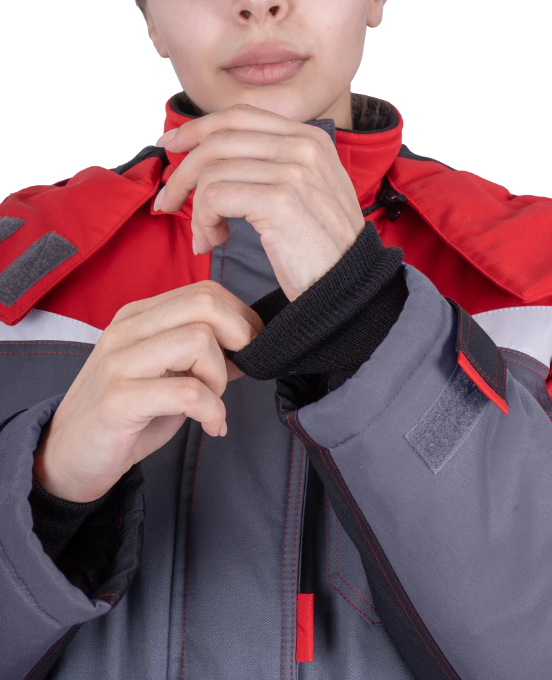 Костюм женский КМ-10 ЛЮКС от пониженных температур воздуха и ветра, механических воздействий и ОПЗ (куртка, брюки), серый/красный/черный