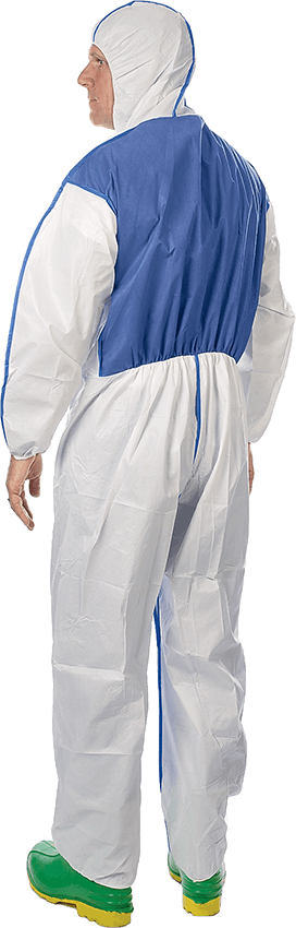 • Изготовлен из материала, покрытого микропористой многослойной пленкой, вставка на спине из полипропиленового 4-х слойного SMMS материала.