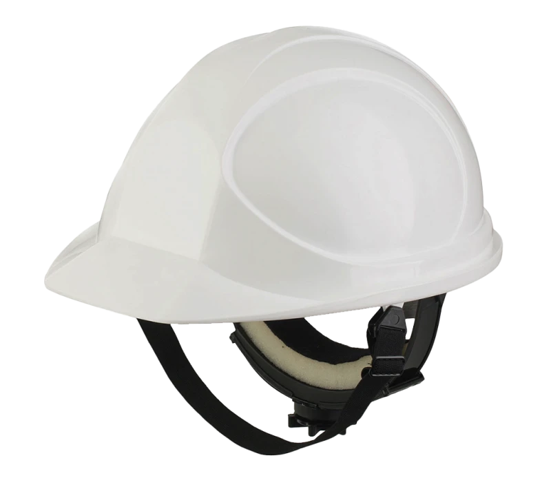 Защитная каска с текстильным оголовьем и ленточным регулятором размера для защиты работников от падающих предметов и боковых ударов, а также для обеспечения дополнительной защиты от других механических воздействий, влаги и электрического тока напряжением до 440 В.