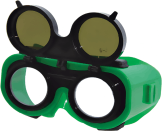 Очки современные, удобные, с высокими эксплуатационными свойствами состоят из мягкого корпуса из ПВХ пластиката, в котором установлен жесткий стеклодержатель с прозрачными пластмассовыми защитными стеклами Plexiglas CE и откидного стеклодержателя с минеральными защитными стеклами-светофильтрами.